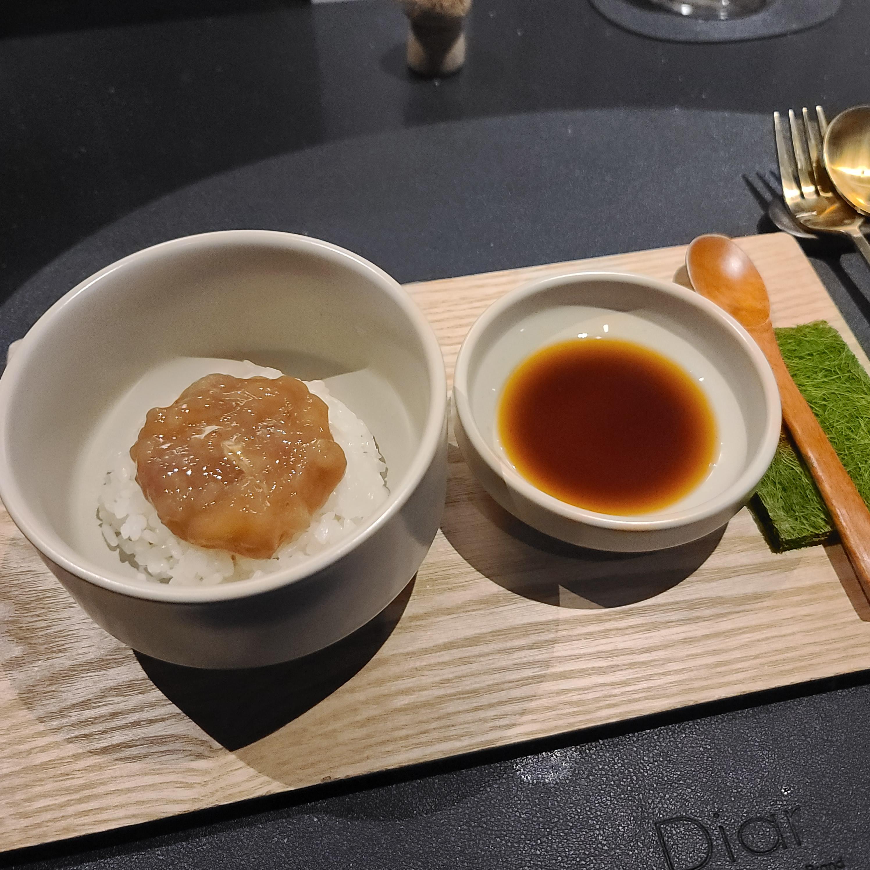 다음으로 게장이 올라간 밥이 나왔다. 이 시점에 밥이라니 의아했지만 스시 오마카세에서도 이쯤엔 후토마키나 일반 마끼 요리가 나오기 때문에 비슷한 종류라 생각했다. 게장을 살짝 비벼 감태에 한숟갈 올린 후 한입에 털어넣으면 감태의 향에 반하고 게장의 부드러움과 쌀밥의 찰짐에 두 번 반한다. 실제로 감태를 먹어본 건 처음이었는데 낯선 식감이긴 했다. 김보단 훨씬 두껍고 향도 독특해서 자칫 많이 먹으면 쓴맛이 느껴지는듯 했지만 짭짤한 게장과 부드러운 밥이 만나 이 역시 너무나도 조화로웠다.