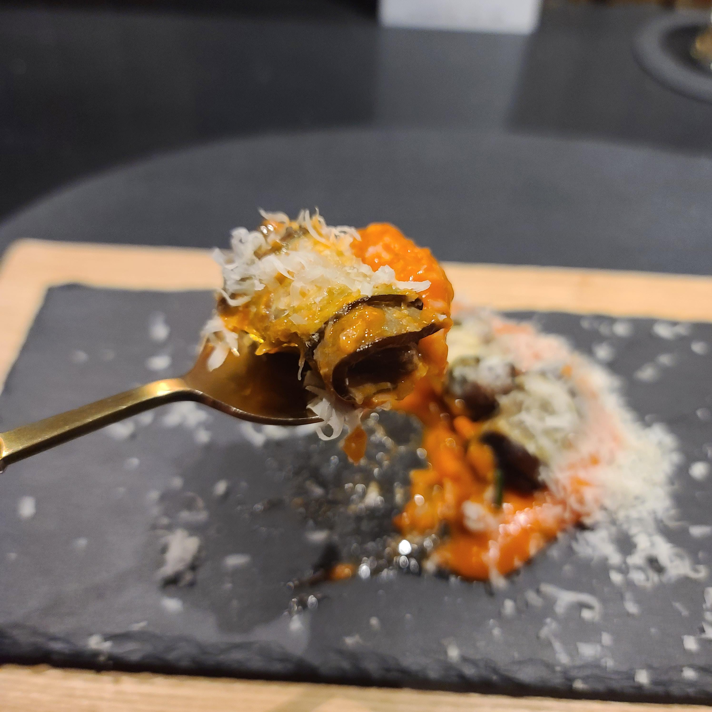 그 다음은 토마토소스 위에 가지런히 말린 가지 요리였다. 가지를 썩 좋아하진 않지만 가지의 맛이 전혀 느껴지지 않을 정도로 참 재밌는 음식이었다. 같이 갔던 일행은 토마토소스가 너무 맛있어서 그릇을 핥아먹고 싶다고 할 정도였다. 위에 뿌려진 그라나파다노 치즈가 은은하게 잘 어울렸다.
