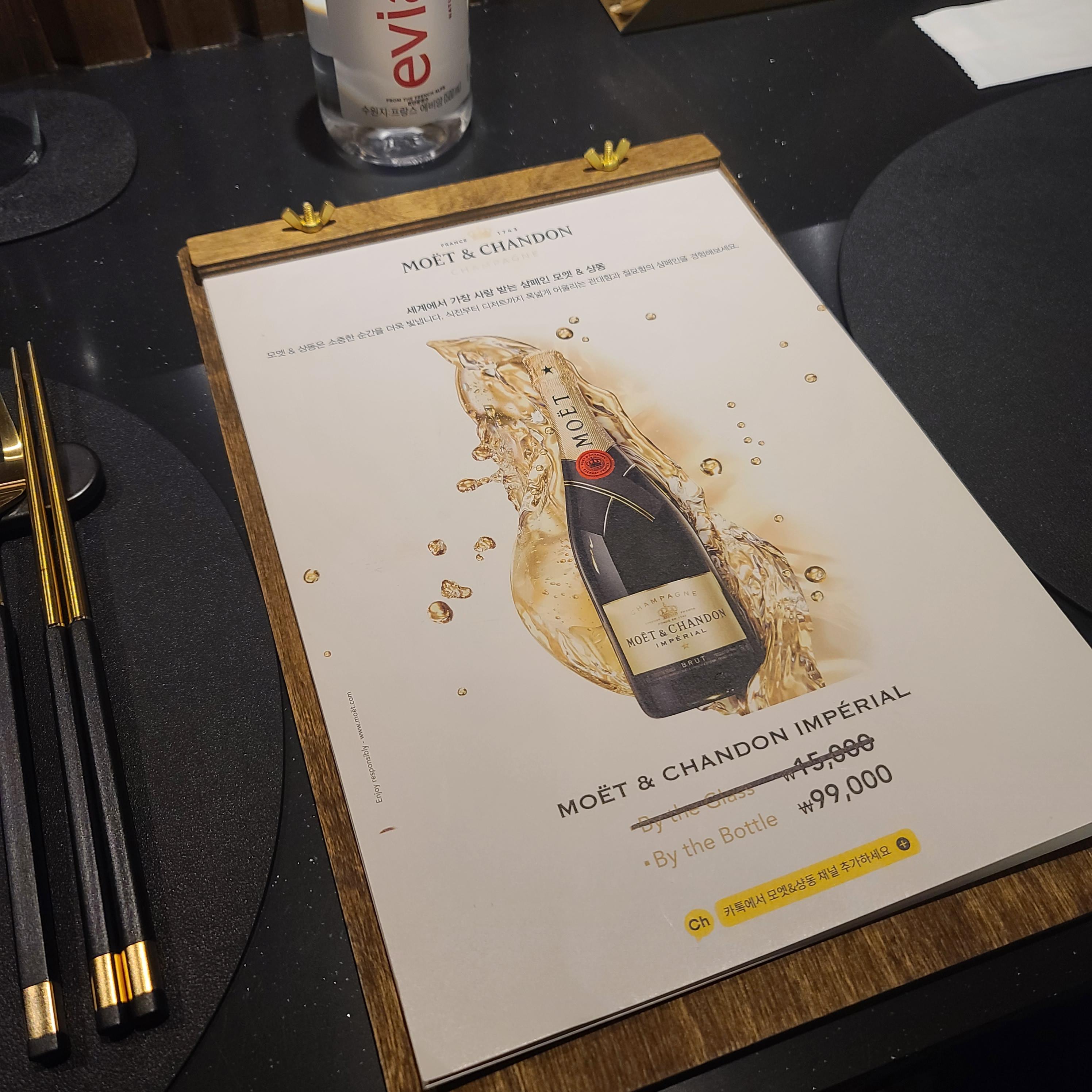 바로 뒤에 마련된 옷걸이에 외투를 걸고 자리에 착석하면 이용 방법을 상세하게 설명해 주신다. 전체 코스요리로 나오기 때문에 주류만 주문하면 되는데, 나는 이름을 외우기 힘든 스파클링 와인을 주문하고 요리 중간쯤 되었을 땐 소곡주라는 전통주를 부탁드렸다. 현재 이벤트를 진행하고 있는 와인 종류가 많은데 셰프님께서 음식과 잘 어울릴 만한 적절한 주류를 추천해 주시니 잘 몰라도 친절하게 잘 알려 주신다.
