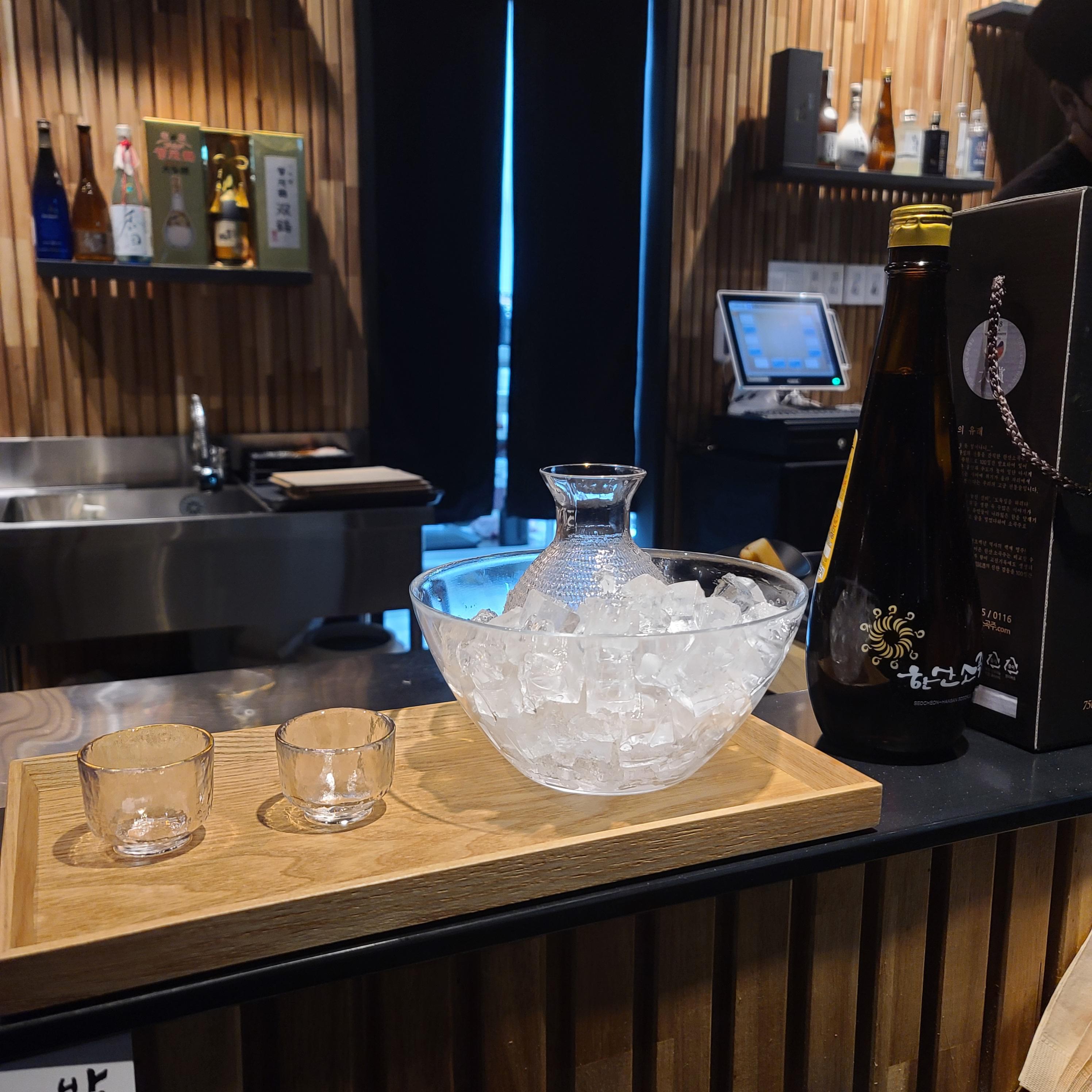 이 타이밍에 두 번째로 주문한 전통주 한산소곡주가 나왔다. 평소 전통주를 접해 본 적이 별로 없었는데 지금 나오는 음식과 매우 잘 어울릴 거라 해 주셨다. 믿고 마시는 술이라니. 잔은 그때그때 술의 종류에 따라 센스 있게 매치해 주시는데 이때는 술병이 정말 귀여웠다. 잔도 불투명한 느낌의 두툼한 그립감을 가진 잔이었는데 짠 하는 소리가 예쁜 잔이었다.