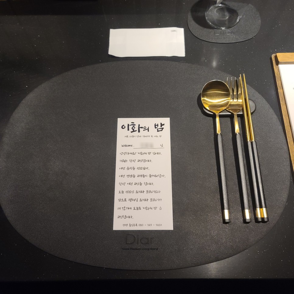 가게로 들어가면 입구에서부터 셰프님께서 반갑게 맞이해 주신다. 예약자 성함을 여쭤보시고는 준비된 자리로 안내해 주시는데 테이블보에 카드 하나가 놓여 있고 맨 위에는 내 이름이 적혀 있다. 이 부분에서 적지 않은 감동을 받았다. 예약자 한 명, 한 명 허투루 생각하지 않고 신경써 주시는 느낌이랄까. 이날의 감동은 이게 끝이 아니었다.