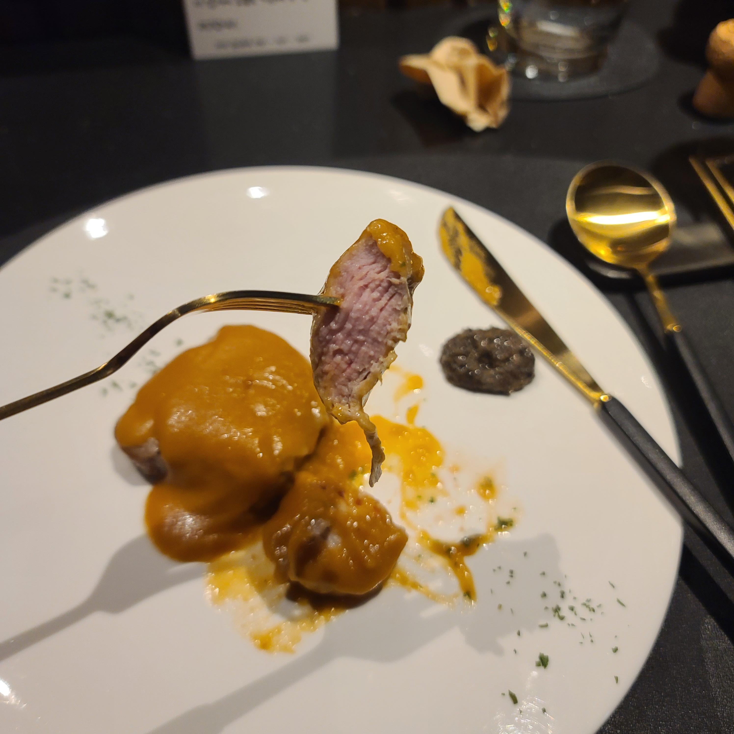 다음은 메인으로 돼지고기 안심 스테이크가 나왔는데 수비드를 한 건지 굉장히 부드러웠다. 칼을 대는 순간 결대로 찢어지듯 부드럽게 썰렸고 위에 뿌려진 소스는 데미그라스 소스인데 향은 간장 조린듯한 향이었지만 맛은 기가 막히게 맛있었다. 달달하면서도 짭짤하고 돼지고기에도 이런 소스가 어울리는구나 싶은 생각이 들었다. 또 옆에 나온 소스는 트러플소스인데, 처음부터 트러플을 올려 먹으면 데미그라스 소스의 맛이 잘 안 느껴질 거라 하셔서 트러플은 마지막에 올려 먹었다. 개인적으로 트러플의 향이 너무 강해서 음식에 따라 호불호가 갈리는 편인데 돼지고기 안심 스테이크와는 너무나도 잘 어울렸다. 어느 하나 독특하게 튀는 것 없이 정말 조화가 평화조약 수준이었다.